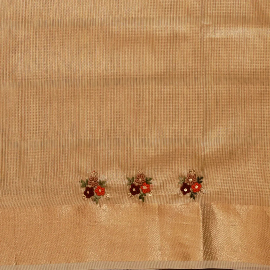 A soft lemon tissue saree that whispers elegance, adorned with delicate Kantha stitches and dainty French knots — each thread a story of craftsmanship. The woven silver border adds a regal shimmer, while playful tassels at the pallu complete the look with grace and charm.