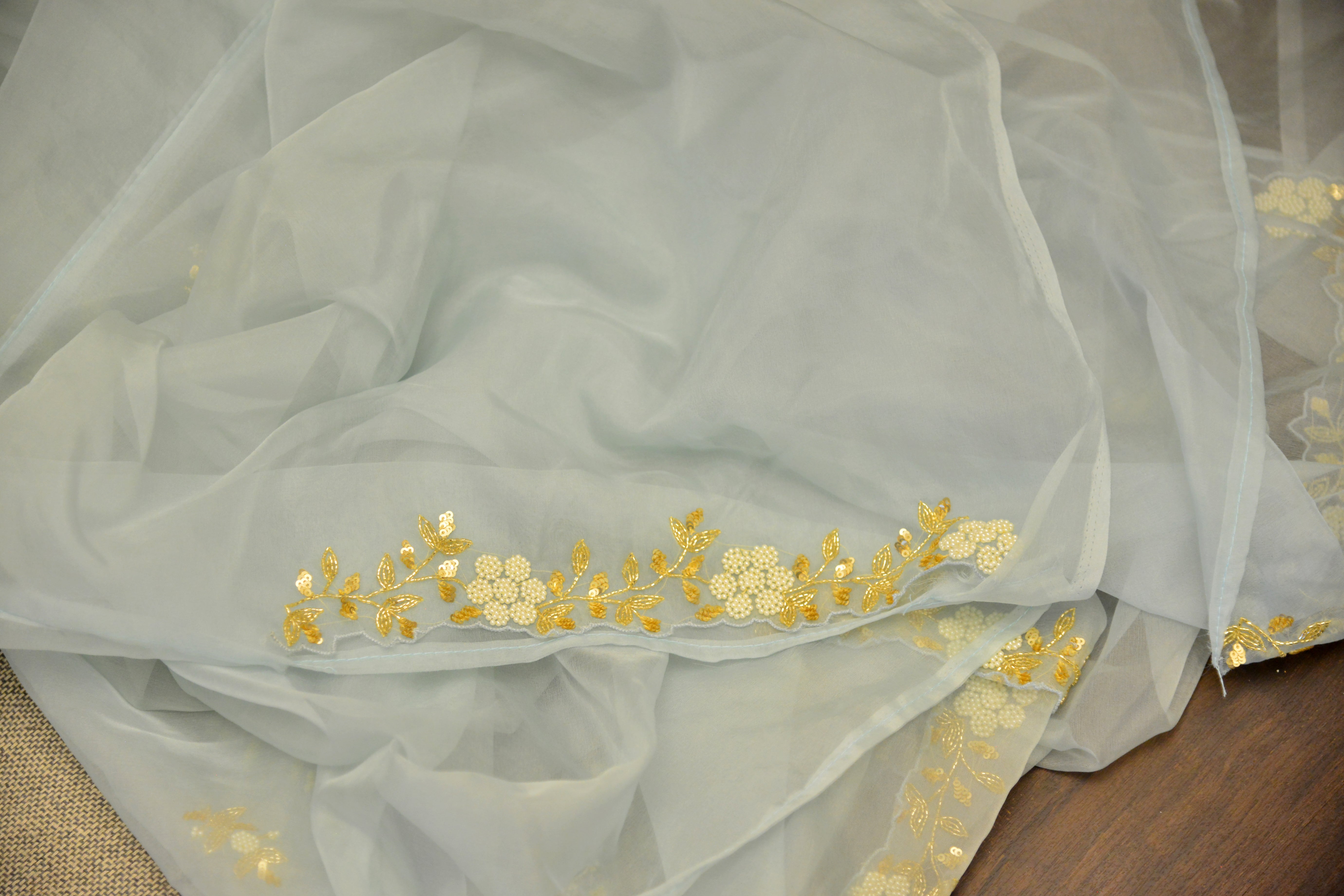 Smoky sky blue pure organza with handwork of cutdana all over the beautiful drape