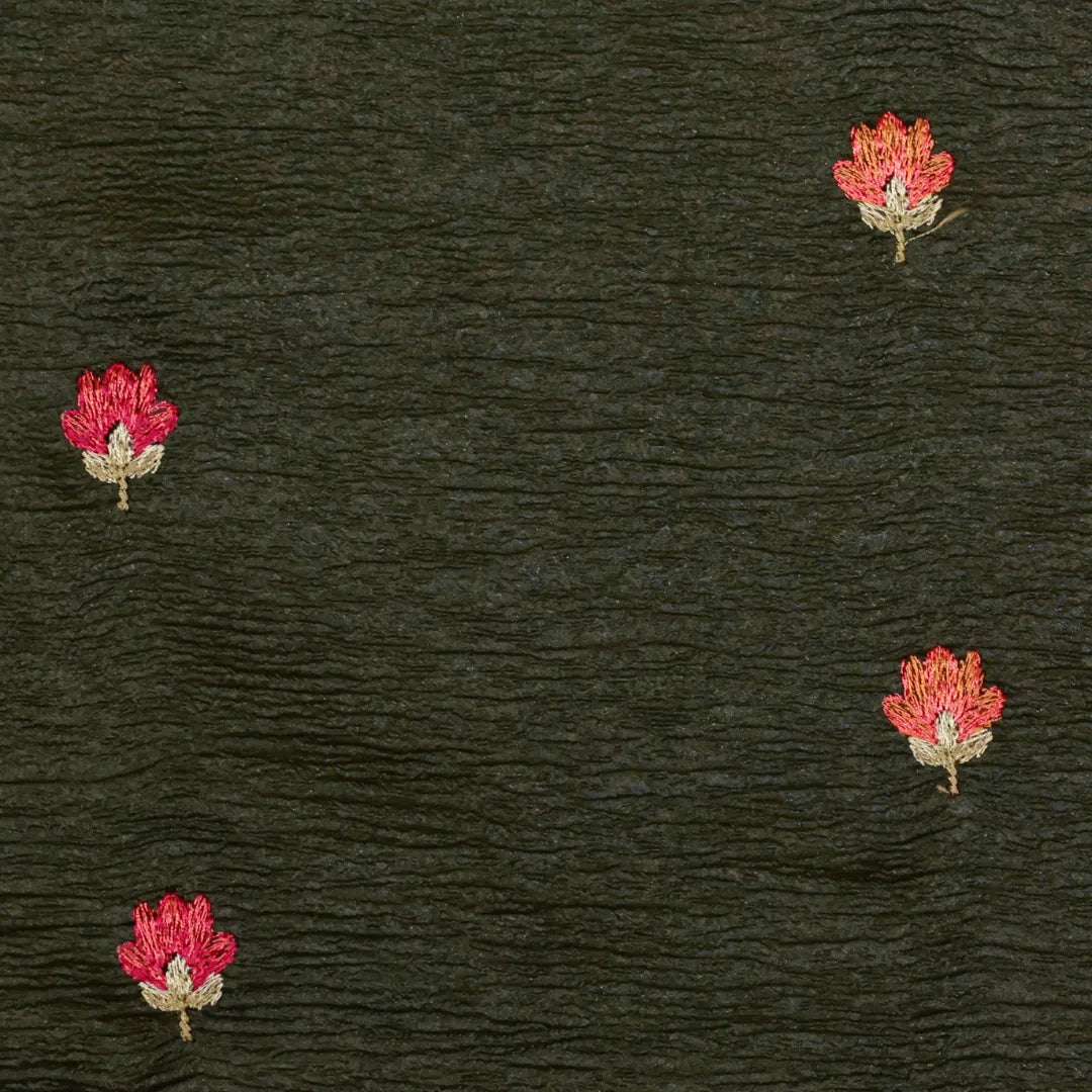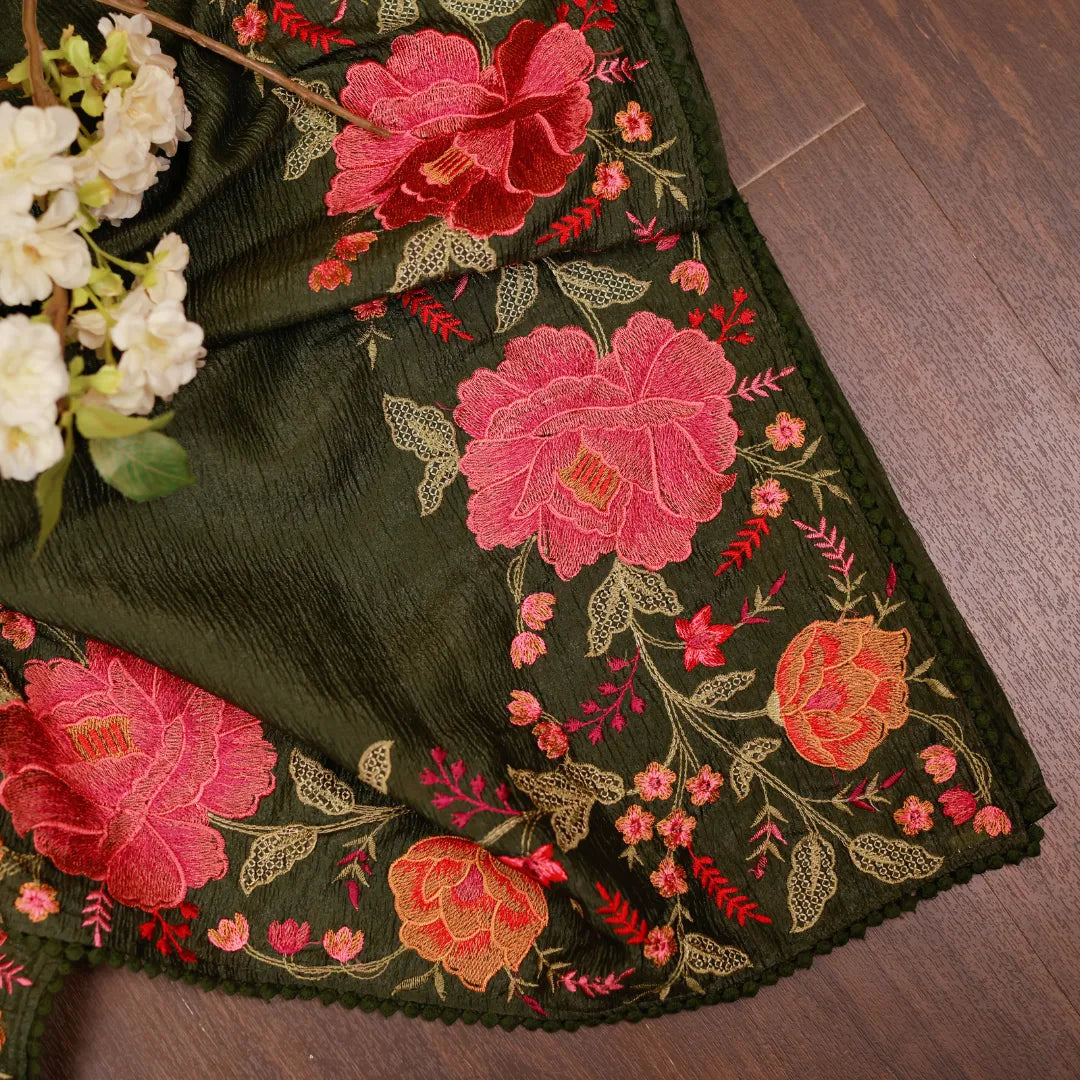 In a regal bottle green shade, this crushed tissue saree is adorned with exquisite Parsi embroidery that runs all over — extending gracefully to the blouse. Rich, intricate, and timeless, it’s a statement drape crafted for grand occasions and unforgettable moments.
