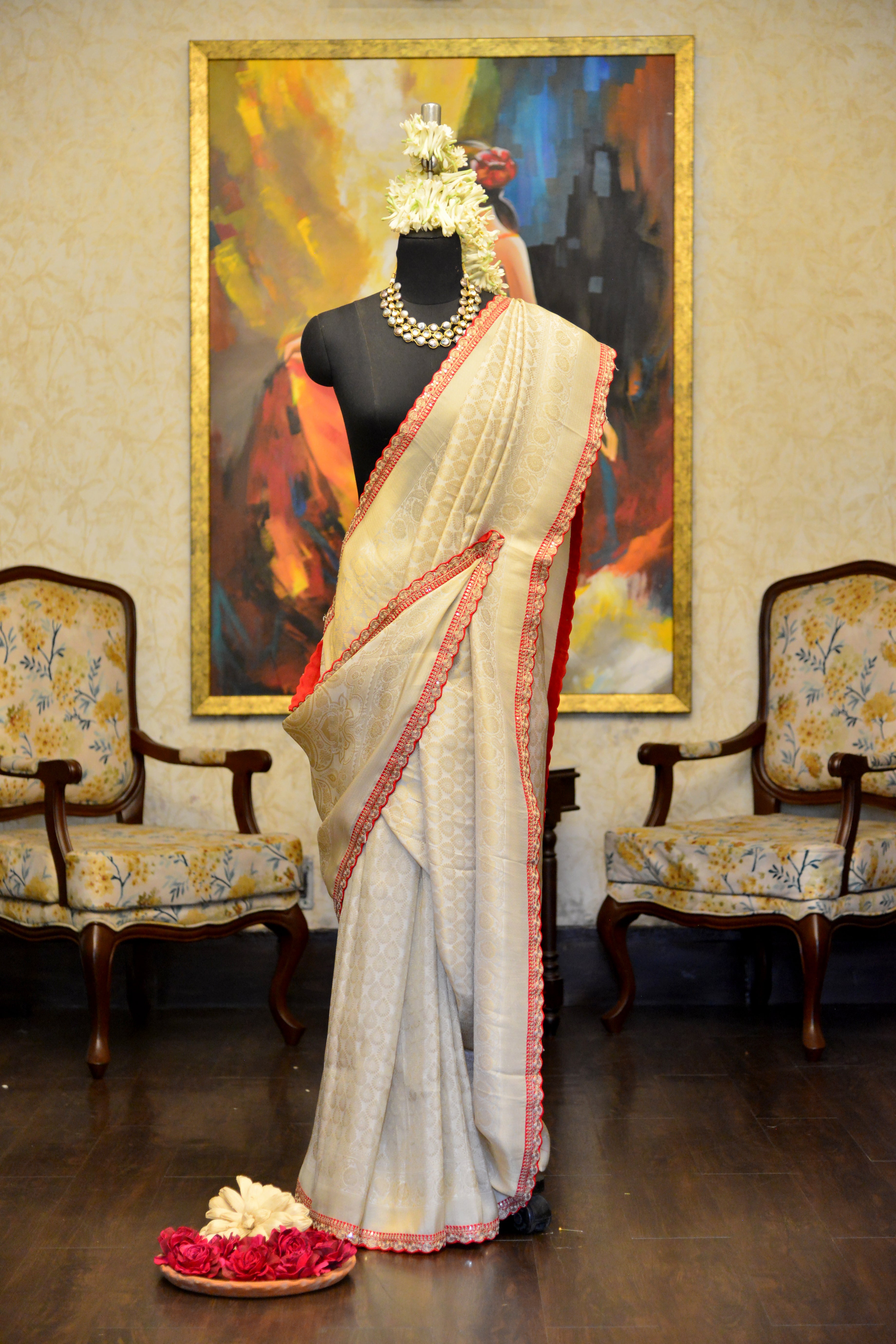 An elegant ivory silk saree with a red border, perfect for timeless festive and wedding looks.