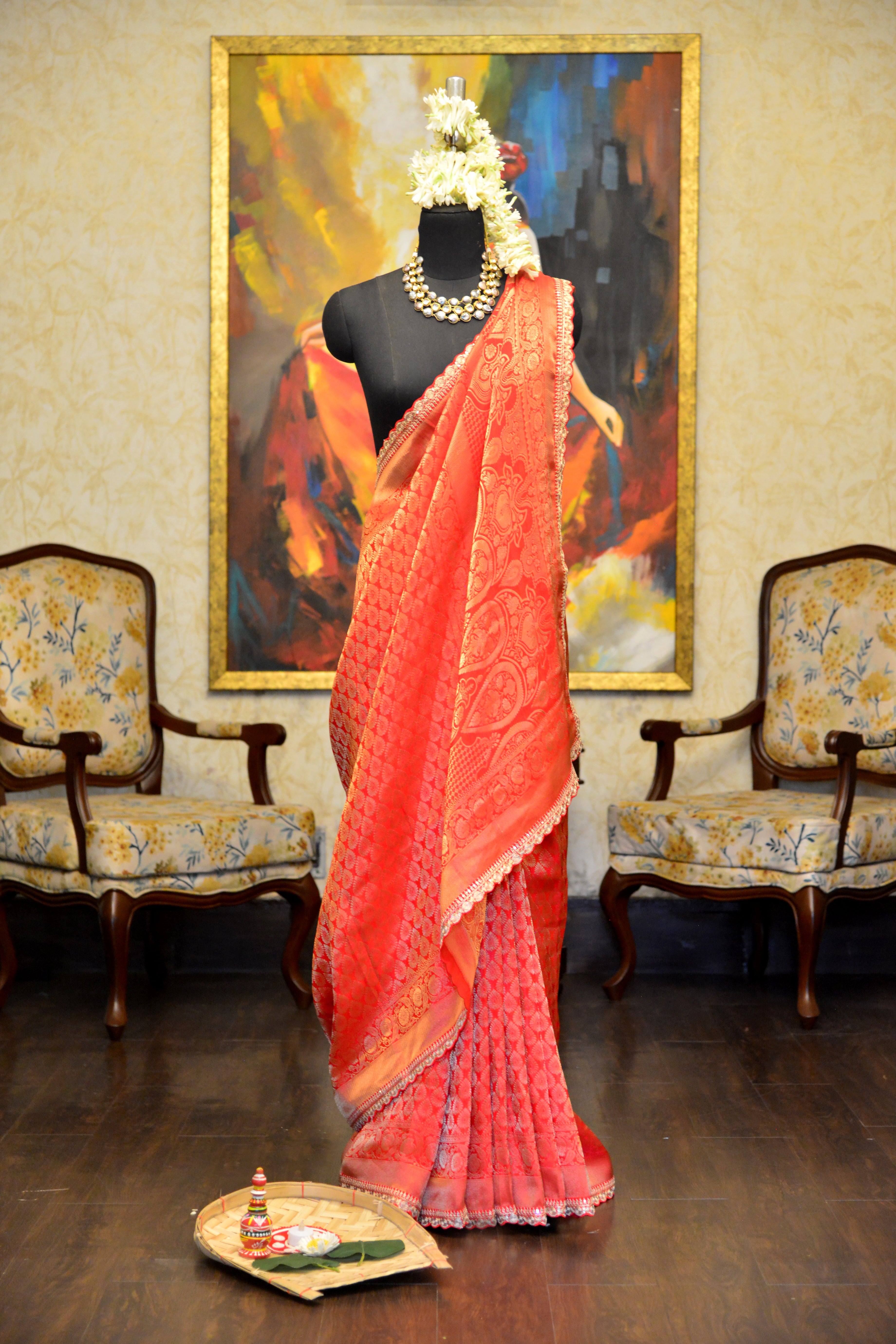 Radiant red silk saree with intricate golden weaving and a richly detailed pallu.