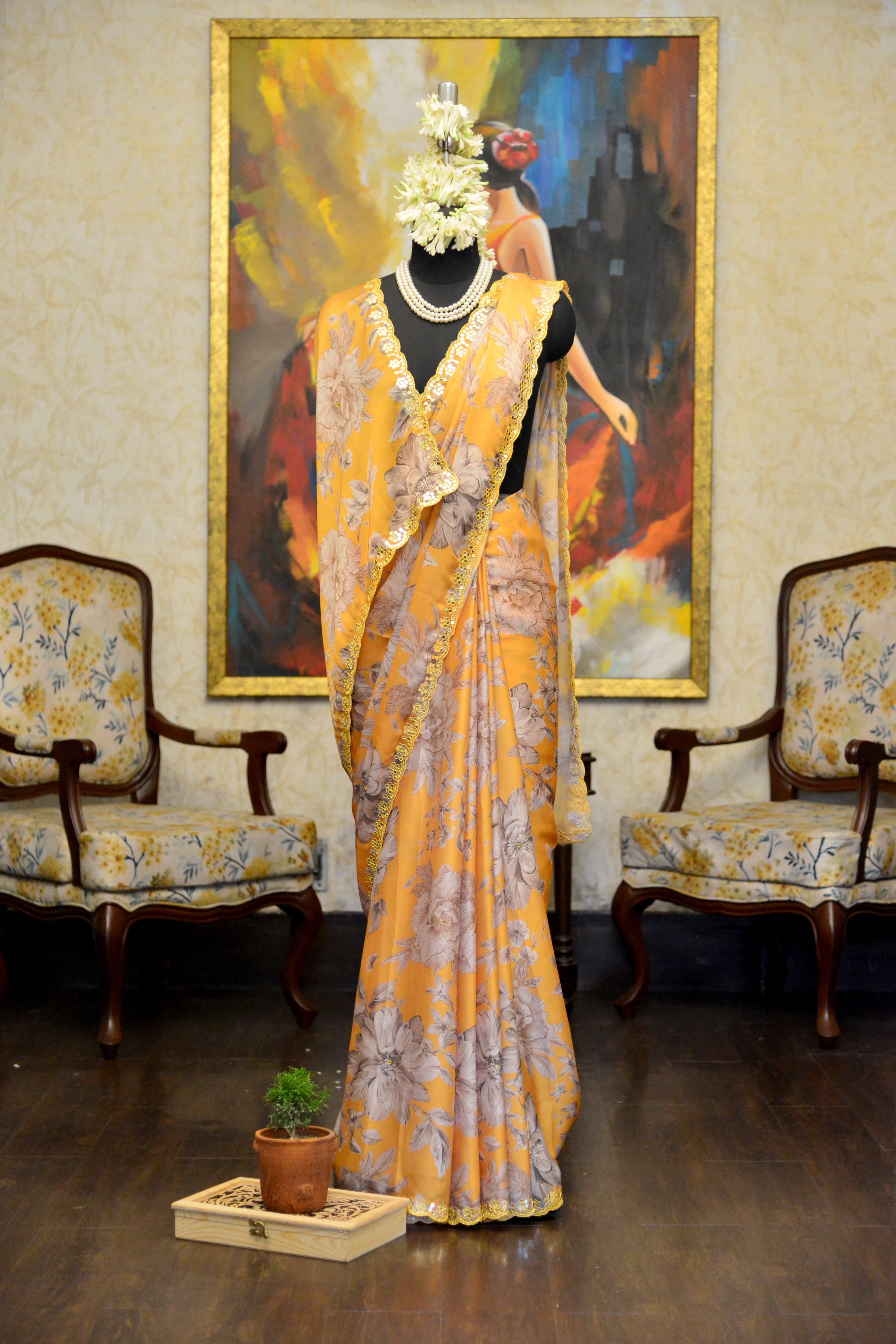 Elegant mustard-orange saree with large floral prints, highlighted by a delicate golden lace border.