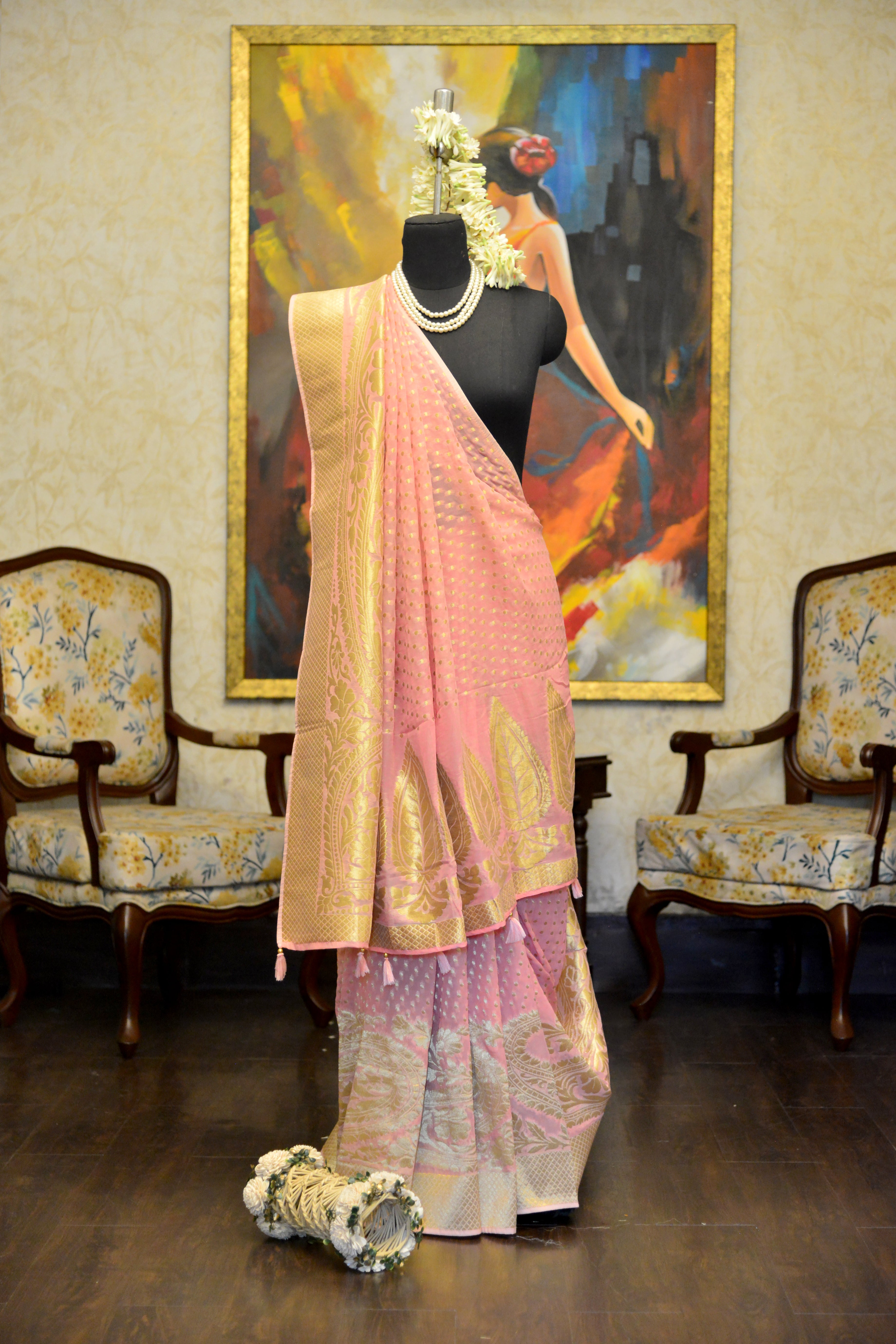 Graceful pastel pink saree with golden zari work, intricate leaf motifs, and a beautifully woven pallu.