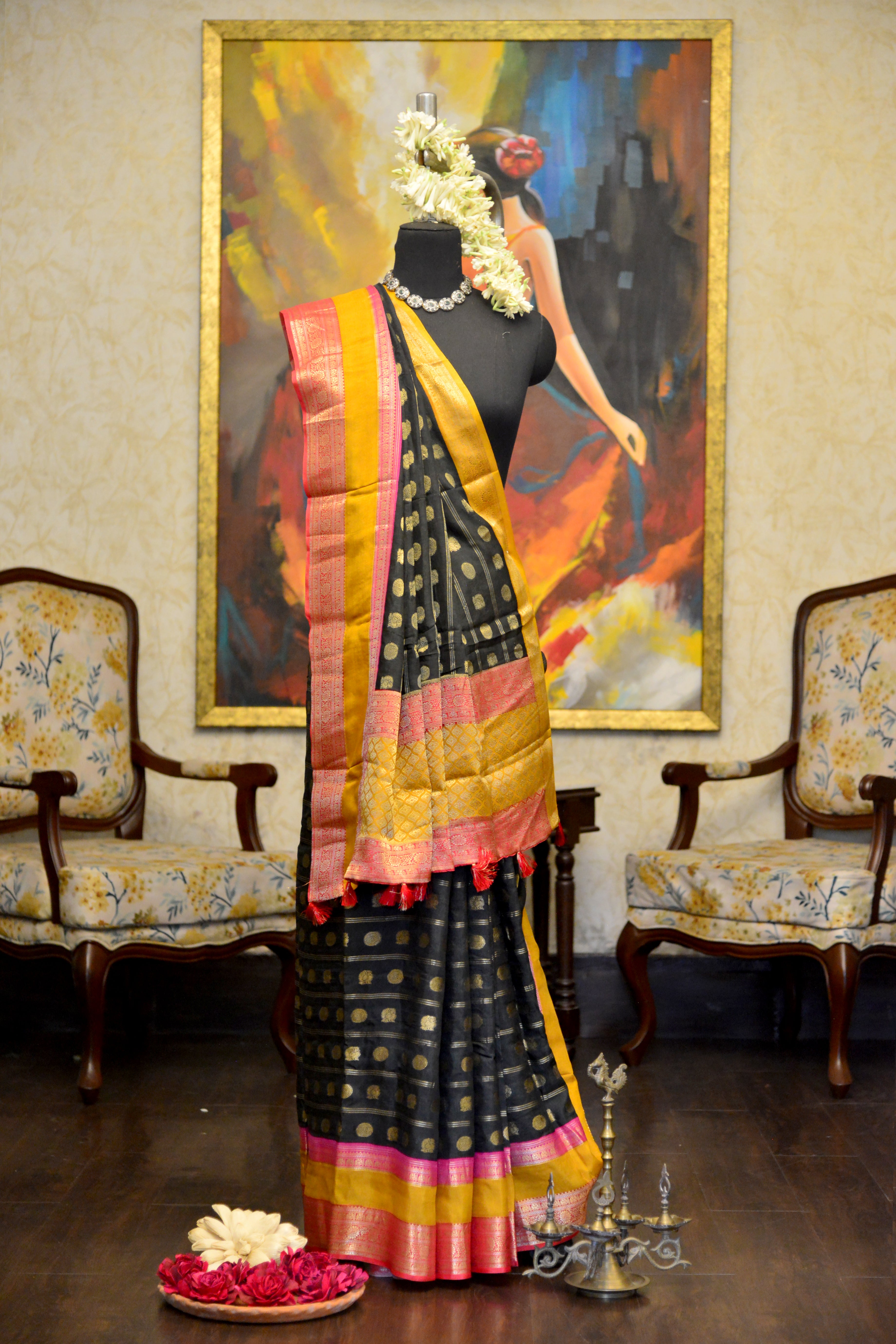Striking black saree with golden polka motifs, complemented by a vibrant yellow and pink zari border and rich woven pallu.