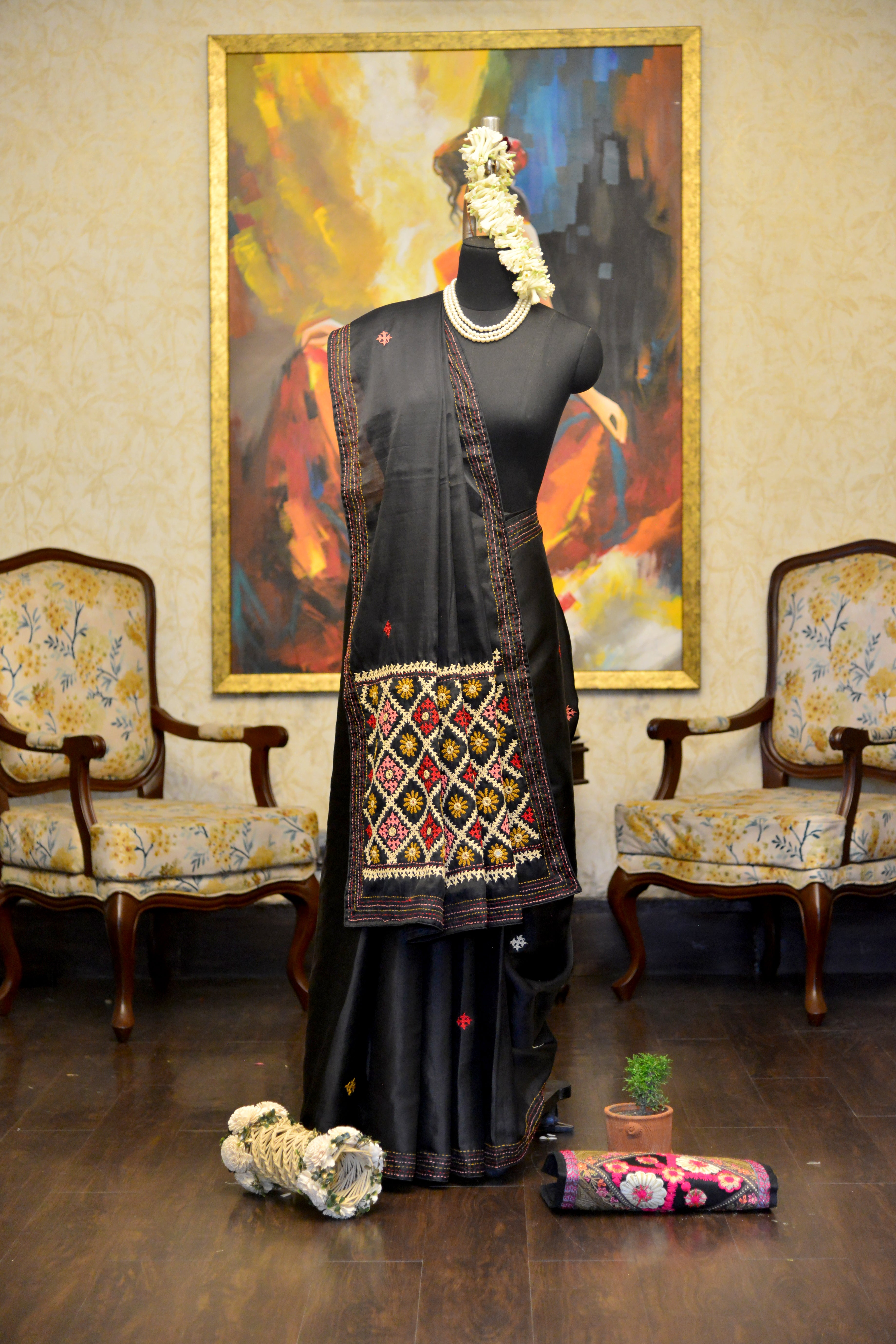 A striking black saree with vibrant multicolor embroidery, perfect for making a bold yet elegant statement.