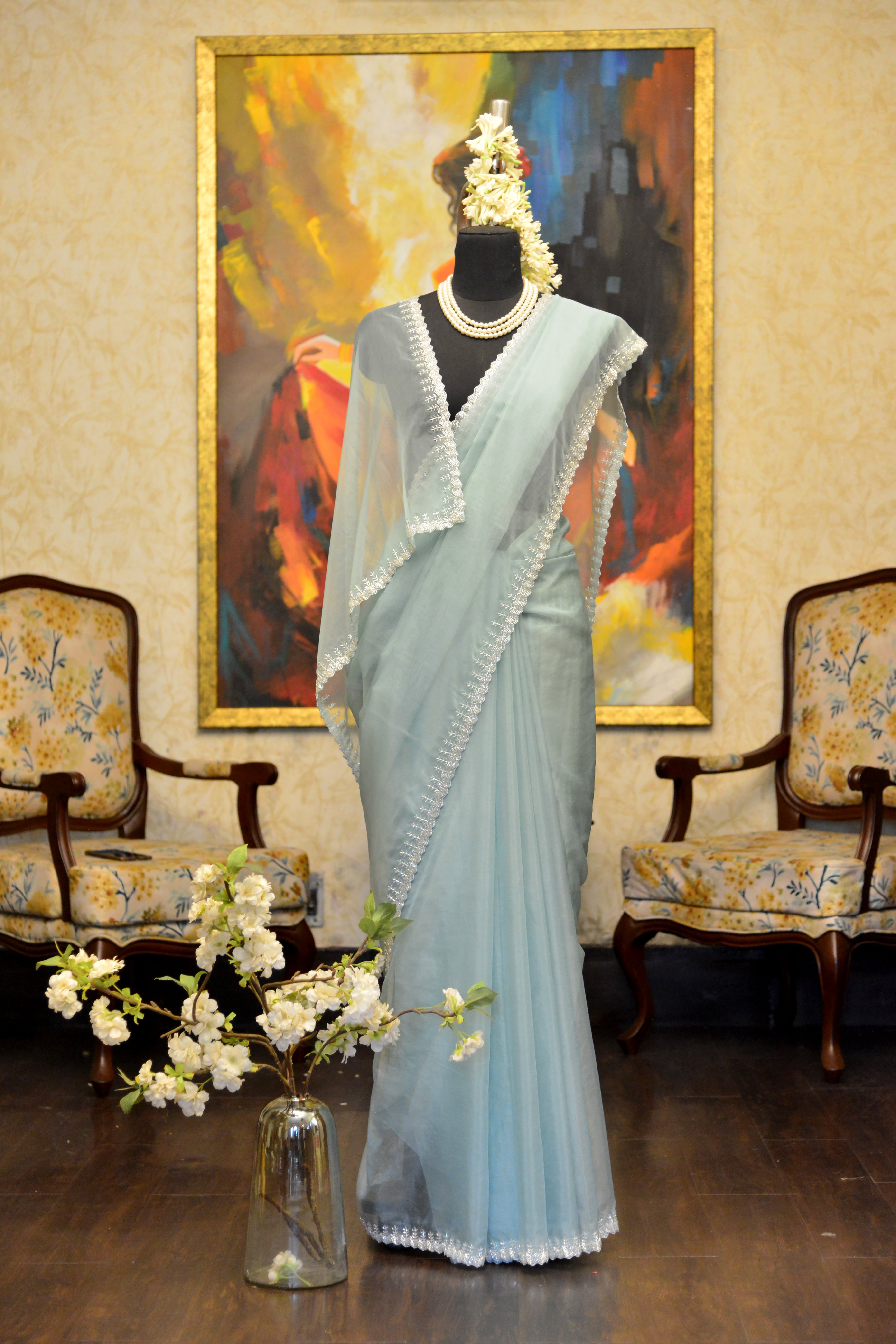 A dreamy smoky blue pure organza saree, adorned with exquisite cutdana handwork that sparkles across every drape. The rich detailing continues seamlessly over the blouse, creating a complete ensemble of elegance and luxury — perfect for festive evenings and grand celebrations.