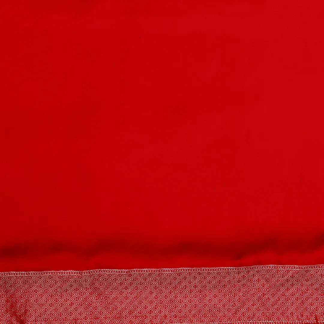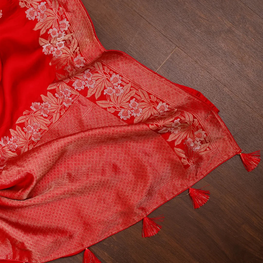 A timeless sindoori red pure Mashru silk Benarasi, adorned with exquisite Meena weaving all over. Despite its regal look, the drape feels feather-light on the body, making it perfect for long celebrations and special occasions. A saree that defines luxury with ease and grace.