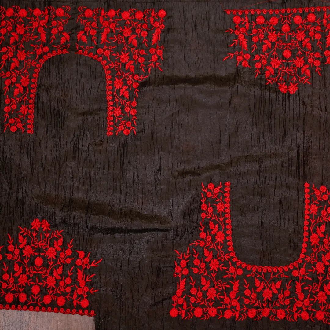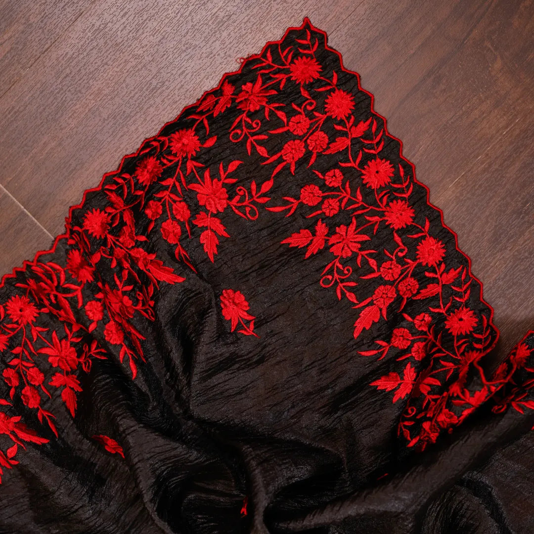 A striking charcoal black crushed tissue saree, elevated with rich maroon red embroidery running gracefully along the body. Intricate detailing adds depth and drama, making this drape a true statement of luxury and elegance — perfect for evenings that call for unforgettable style.