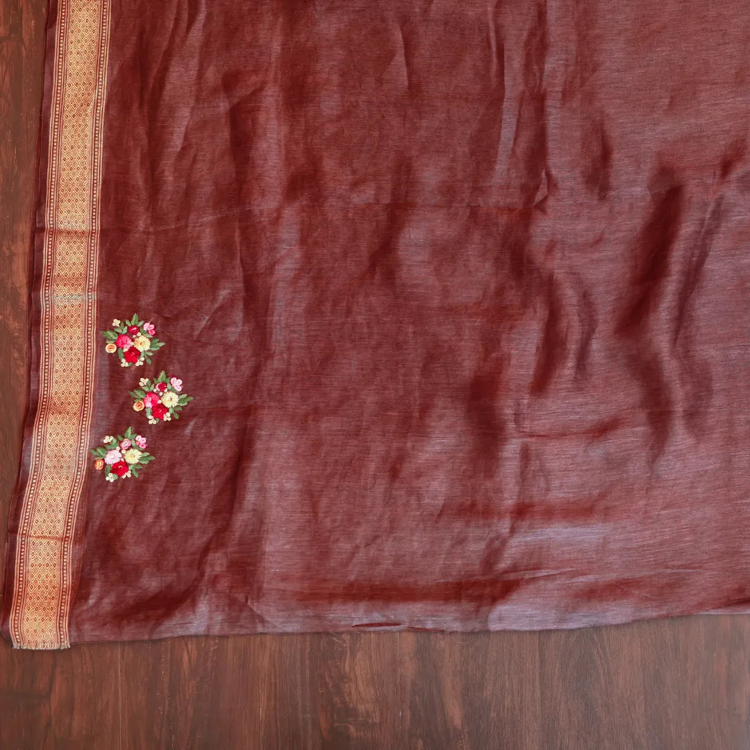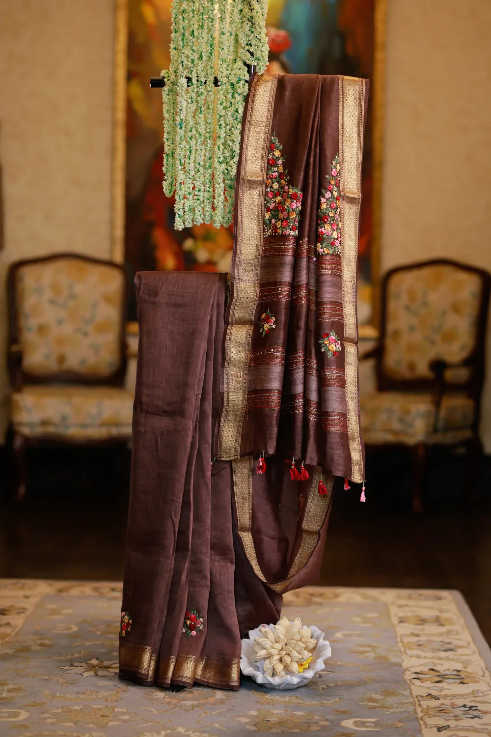 A smart chocolate-hued pure linen saree, enriched with delicate handwork that flows across the body and blouse. The oxidized gold border adds a regal edge, making this drape a perfect balance of subtle sophistication and timeless charm. An elegant choice for statement occasions.
