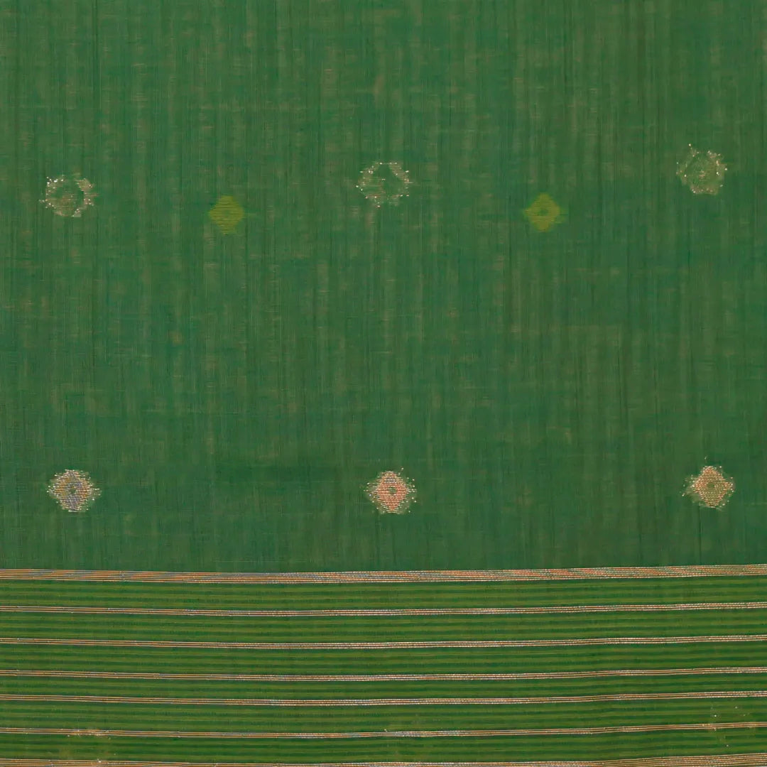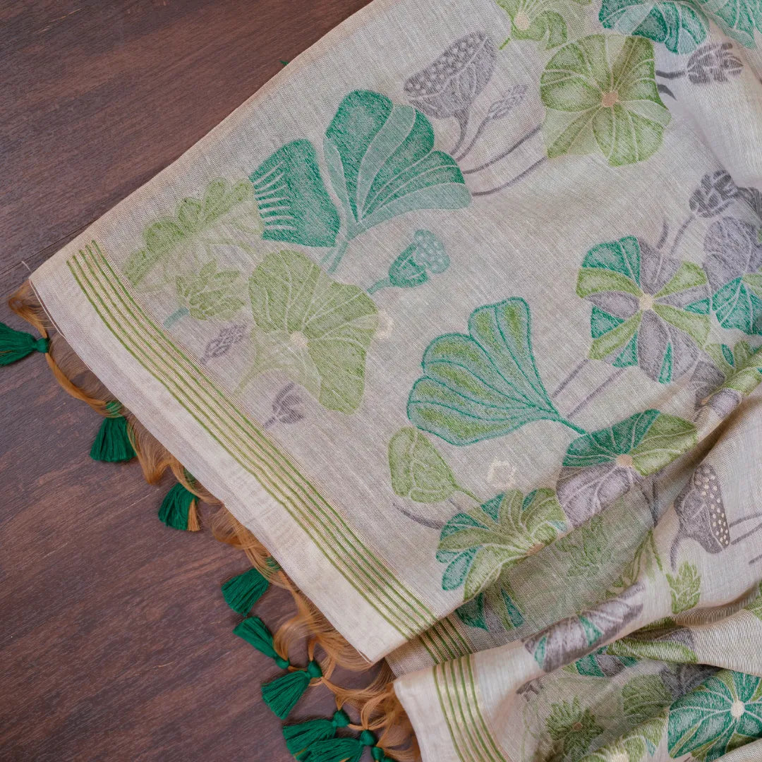 An elegant off-white pure handloom cotton saree with silk on weft, adorned with delicate resham weaving all over. Graceful in every drape, it’s finished with soft tassels on the anchal — a timeless piece that blends subtle sophistication with everyday charm.